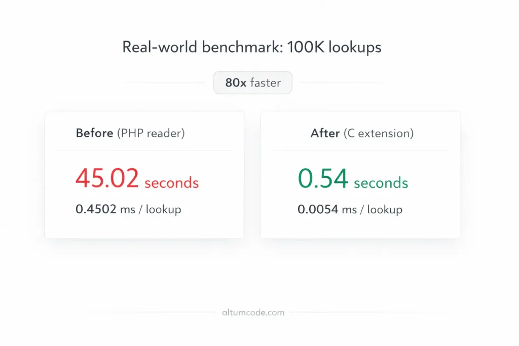 On a test with 100,000 lookups, the average IP lookup time for the PHP reader was 0.4502 ms vs the C extension average of 0.0054 ms (80x faster).